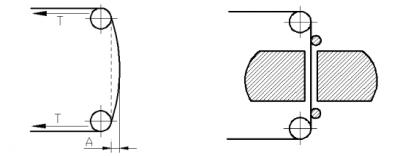 鉬絲具有一定的剛性,靜止時受拉力作用與導(dǎo)輪相切呈直線狀,而在工作過程中受往復(fù)慣性力作用(慣性力隨絲速變化,絲速大則慣性力也大)向外呈弧線狀,它與靜止時的位置有一個偏移量