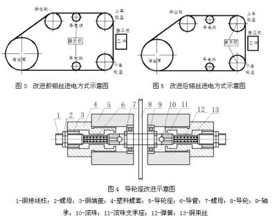 3)進(jìn)電方式的改進(jìn)。DK7732型快走絲線切割機(jī)采用鉬絲在導(dǎo)電塊表面無(wú)束滑行的方式進(jìn)電(如圖3所示),當(dāng)鉬絲在高速運(yùn)行中發(fā)生抖動(dòng)時(shí)會(huì)使鉬絲與導(dǎo)電塊之間接觸不穩(wěn)定,造成進(jìn)電不穩(wěn);鉬絲與導(dǎo)電塊處產(chǎn)生二次火花放電,降低施加在鉬絲與工件間的脈沖能量,從而減緩切割速度;火花放電會(huì)在導(dǎo)電塊表面切割出細(xì)槽,此細(xì)槽會(huì)卡信鉬絲,增加鉬絲的運(yùn)行阻力,造成鉬絲被拉斷及工件報(bào)廢。如果將負(fù)極前移至與導(dǎo)輪座相連,改導(dǎo)電塊進(jìn)電為導(dǎo)輪座進(jìn)電,導(dǎo)電塊只起支承作用,改進(jìn)后的導(dǎo)輪座如圖4所示。圖中滾珠10通過(guò)彈簧的作用與導(dǎo)輪軸緊接觸,這樣脈沖電流從接線柱1、銅束絲13、滾珠10將電流傳遞給導(dǎo)輪,鉬絲在導(dǎo)輪上進(jìn)電,改進(jìn)后,不但縮短了進(jìn)電路線,也增大了鉬絲的接觸長(zhǎng)度,使進(jìn)電可靠,改進(jìn)后的進(jìn)電方式如圖5所示。