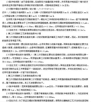 第一次切割時(shí)的主要目的是快速穩(wěn)定切割,盡快地去除工件上的余量,并使工件基本符合圖紙要求,其脈沖參數(shù)、鉬絲補(bǔ)償間隙及走絲速度的選用原則及計(jì)算方法如下: