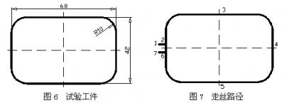 在改造過(guò)的DK7732型快走絲線切割機(jī)上,使用多次切割技術(shù)切割如圖6所示的凸模工件。切割分三次完成,走絲路線如圖7所示。第一次粗切割沿著1→2→3→4→5→6→7路徑,第二次粗切割沿著7→6→5→4→3→2→1路徑進(jìn)行,第三次精微切割沿著1→2→3→4→5→6→7路徑。