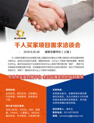 第18屆上海國際機床展(EASTPO 2016)將于2016年9月25-28日在國家會展中心(上海)舉行。第18屆上海國際機床展主辦方打破傳統(tǒng)買賣對接模式,創(chuàng)新推出了“千人賣家項目需求洽談會”活動。
