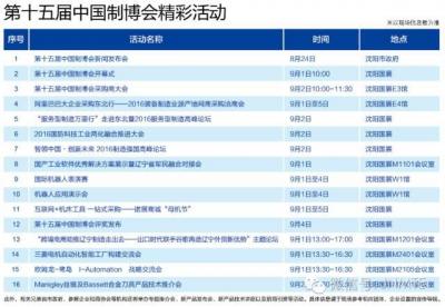 博覽會(huì)主要活動(dòng)包括開(kāi)幕式、中國(guó)制博會(huì)采購(gòu)商大會(huì)、阿里巴巴大企業(yè)采購(gòu)東北行——2016裝備制造業(yè)原產(chǎn)地網(wǎng)商采購(gòu)洽商會(huì)、“服務(wù)型制造萬(wàn)里行”走進(jìn)東北暨2016服務(wù)型制造高峰論壇、2016國(guó)防科技工業(yè)兩化融合推進(jìn)大會(huì)、智領(lǐng)中國(guó)·創(chuàng)贏未來(lái)2016制造強(qiáng)國(guó)高峰論壇、國(guó)產(chǎn)工業(yè)軟件優(yōu)秀解決方案展示暨遼寧省軍民融合對(duì)接會(huì)、國(guó)際機(jī)器人表演賽、機(jī)器人應(yīng)用演示會(huì)等。