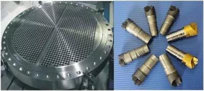 孔深度與孔徑比較大(一般≥10,甚至可達100以上,核電產(chǎn)品中深度和孔徑比可≥ 50),鉆桿細,鋼性差,工作時容易產(chǎn)生偏斜和振動,孔精度及表面質(zhì)量難以保證;切屑量大而排屑通道長,若斷屑不好,堵屑鉆頭損壞,孔加工質(zhì)量難以保證;鉆頭在近似封閉情況下工作,工作時間長,熱量不易排出,鉆頭極易磨損。而工研所開發(fā)的Φ16.28-Φ25.35等多種規(guī)格的管板鉆,在核電、鍋爐、化工行業(yè)的管板加工試驗取得了較好的效果。