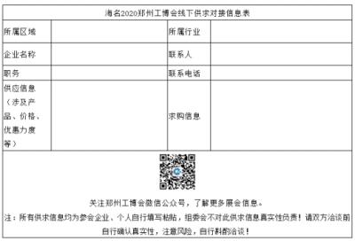 鄭州工博會(huì)組委會(huì)將在2020年展會(huì)現(xiàn)場(chǎng)免費(fèi)提供自主供求對(duì)接展示墻,所有到會(huì)參觀的企業(yè)均可在觀眾換證處免費(fèi)領(lǐng)取供求對(duì)接信息表,并粘貼至現(xiàn)場(chǎng)供求展示墻,保證企業(yè)更大的收益,為中西部企業(yè)供需對(duì)接提供更便捷的服務(wù)!海名鄭州工博會(huì)讓供求對(duì)接更便捷!