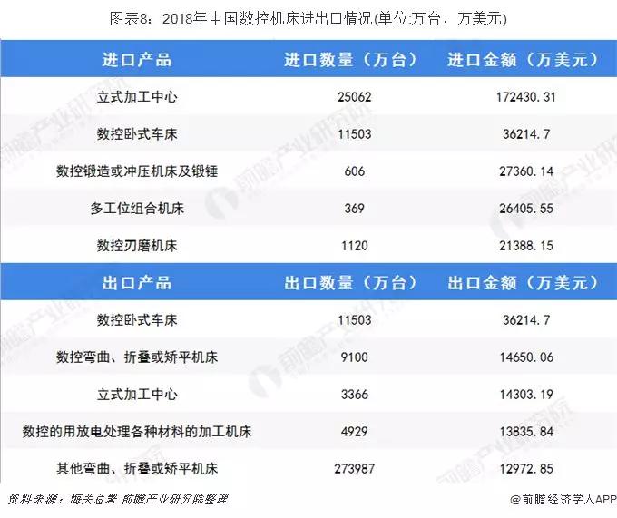 數(shù)控機床進口規(guī)模大 主要進口立式加工中心2018年,我國數(shù)控機床進口產(chǎn)品中數(shù)控臥式車床進口數(shù)量最多,約1.15億臺,立式加工中心進口總額最高,為17.24億美元;我國出口產(chǎn)品中其他彎曲、折疊或矯平機床出口數(shù)量最多,為27.40萬臺,數(shù)控臥式車床出口金額最高為3.62億美元。