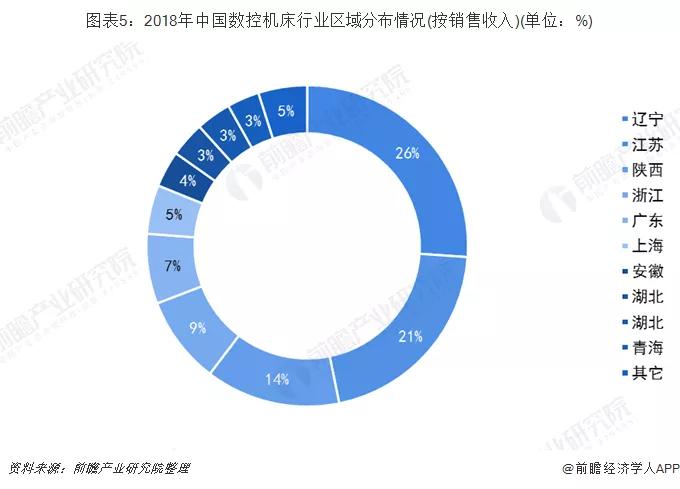 從2018年我國數(shù)控機床銷售收入的分布來看,遼寧、江蘇、陜西、浙江、廣東位于前列,分別占我國前十?dāng)?shù)控機床銷售收入的26%、21%、14%、9%、7%。中國數(shù)控機床行業(yè)CR3為61%,CR5為77%,CR10為95%,我國數(shù)控機床行業(yè)集中度較高。