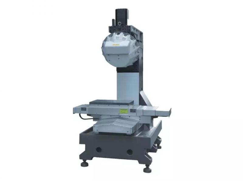 是指主軸軸線與工作臺(tái)平行設(shè)置的加工中心,主要適用于加工箱體類零件。 臥式加工中心的主軸處于水平狀態(tài),通常帶有可進(jìn)行分度回轉(zhuǎn)運(yùn)動(dòng)的正方形工作臺(tái)。一般具有3~5個(gè)運(yùn)動(dòng)坐標(biāo),常見的是三個(gè)直線運(yùn)動(dòng)坐標(biāo)加一個(gè)回轉(zhuǎn)運(yùn)動(dòng)坐標(biāo),它能夠使工件在一次裝夾后完成除安裝面和頂面以外的其余四個(gè)面的加工,最適合加工箱體類零件。