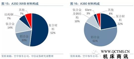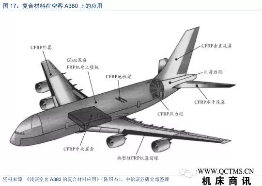 空中客車A380飛機(jī)的復(fù)合材料用量在25%左右,主要應(yīng)用在中央翼、外翼、垂尾、平尾、機(jī)身地板梁和后承壓框等部位。并采用了大量的先進(jìn)復(fù)合材料,比如全球最大樹脂膜浸滲成型的機(jī)身后承壓框,應(yīng)用玻璃纖維增強(qiáng)鋁合金材料(Glare)的機(jī)身上壁板等等。