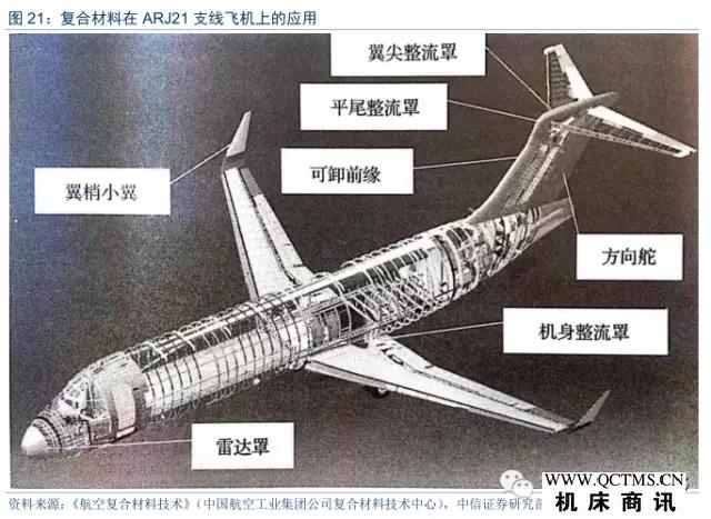 我國ARJ21支線飛機(jī)的升降舵、方向舵、襟副翼、雷達(dá)罩等均使用了復(fù)合材料制造。民用大飛機(jī)C919在尾翼部分及機(jī)翼活動面等次要結(jié)構(gòu)重量上采用了復(fù)合材料;根據(jù)媒體報道,2014年10月30日交付的C919首架后機(jī)身前段也以復(fù)合材料為主體結(jié)構(gòu),是大面積復(fù)合材料制造主體結(jié)構(gòu)在國產(chǎn)民用飛機(jī)上的首次應(yīng)用。