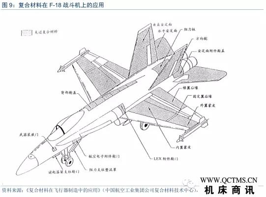 在新一代軍機(jī)上,復(fù)合材料主要應(yīng)用在機(jī)翼、鴨翼、尾翼、垂尾、中機(jī)身壁板、腹鰭、武器艙門等,用量達(dá)到結(jié)構(gòu)重量的19%。