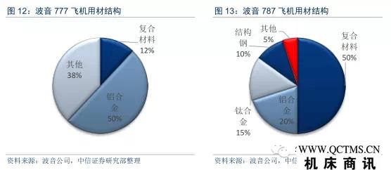國際先進(jìn)軍民用飛機(jī)中,復(fù)合材料用量持續(xù)增長。主要應(yīng)用復(fù)合材料的部位包括整流罩、平尾、垂尾、平尾翼盒、機(jī)翼、中前機(jī)身等。F-22戰(zhàn)機(jī)與空客A380飛機(jī)的復(fù)合材料用量在20%-25%之間,而波音B787與空客A350的復(fù)合材料用量將突破50%,超越鋁合金成為用量最大的材料。飛機(jī)正進(jìn)入復(fù)合材料時代。