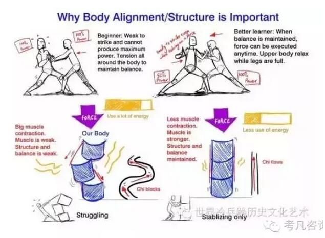 老外的筆記中居然不是拳譜中的招式,而是人體的結(jié)構(gòu)、受力原理、運(yùn)動的原理!上圖中的下半部分,左邊是講如果脊椎骨彎曲的時候,就很難傳遞大的力氣,容易被搬到,容易受傷;右邊講如果脊椎骨挺直,就可以對抗大的力氣,而自己也不覺得吃力,不容易受傷。下面的一張圖是從重心的角度分析,如何才能身體穩(wěn)健。(大家可以按標(biāo)題搜索一下原文,現(xiàn)在還有漢語翻譯版的全文了。)