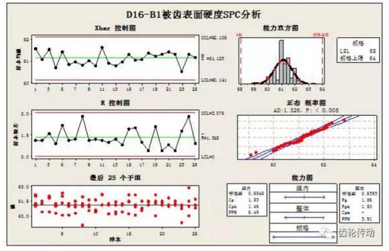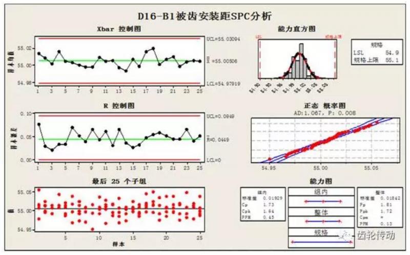 為了保證本批被齒安裝的一致性,用SPC《質(zhì)量工具》來分析安裝距的過程能力:
