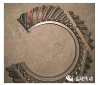斷裂部位:中間偏大端,距小端約5mm左右的位置,其中有1齒在大端齒根圓角處斷裂。斷至齒根
