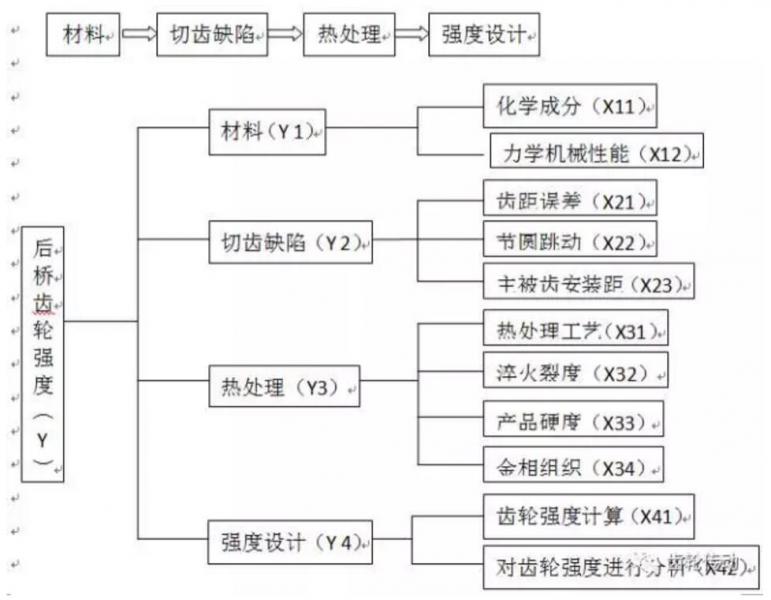 斷齒是齒輪最嚴(yán)重的失效形式,失效后,齒輪的傳動功能喪失,后橋不能實現(xiàn)力矩的傳動,車輛不能正常行駛,容易發(fā)生事故造成人身傷害,為此對該后橋齒輪打齒問題進行立項運用《質(zhì)量工具》分析。