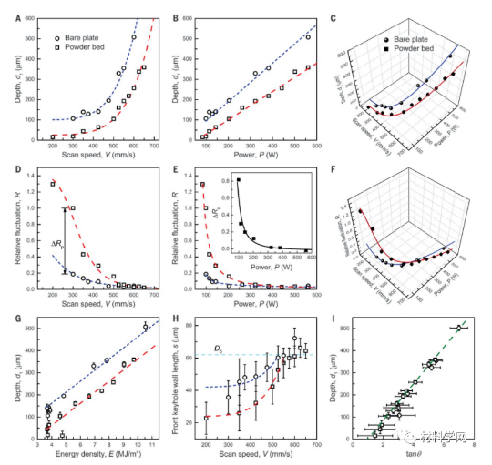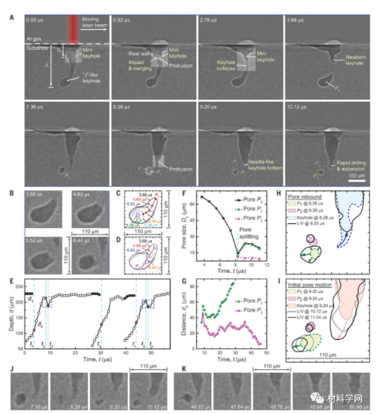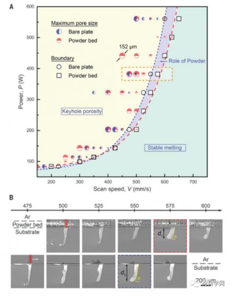 激光粉末床熔合(LPBF)是目前使用最廣泛的金屬添加劑制造工藝,正在徹底改變制造業(yè)。在典型的LPBF工藝中,在數(shù)字計算機(jī)輔助設(shè)計與制圖(CADD)模型的指導(dǎo)下,用高功率密度的激光掃描薄薄的粉末層,對金屬粉末進(jìn)行局部熔化,并將其熔合到前一層。盡管LPBF具有無與倫比的直接制造具有復(fù)雜幾何形狀的零件的能力,但相關(guān)的孔隙率仍然是其致命弱點(diǎn),因?yàn)檫@會損害產(chǎn)品的性能(例如,耐腐蝕性和疲勞壽命)。深入的研究工作促進(jìn)了對孔隙度的理解和控制。高速同步x射線成像顯示,在導(dǎo)致氣孔的各種機(jī)制中,熔化的“鑰匙孔”模式由于其在激光焊接尤其是LPBF中的重要性,近年來引起了廣泛的關(guān)注金屬快速蒸發(fā)產(chǎn)生的強(qiáng)大反沖壓力將周圍的熔體液體向下推,形成一個又深又窄的洞,稱為“鑰匙孔”。在鑰匙孔內(nèi),激光束經(jīng)過多次反射,大大提高了激光的吸收,提高了能量效率。但是,在某些激光條件下,鑰匙孔壁會不斷波動并坍塌。該過程通常歸因于熱毛細(xì)力、馬朗戈尼對流、反沖壓力和氣體等離子體的出現(xiàn)。這種鑰匙孔的不穩(wěn)定性會產(chǎn)生孔,如果孔被凝固前沿捕獲,則孔會成為構(gòu)件中有害的結(jié)構(gòu)缺陷。功率-速度(P - V)圖直接涉及產(chǎn)品的質(zhì)量(密度或孔隙率)工藝參數(shù)。在P-V圖的物理基礎(chǔ)中,一個缺失的部分是所謂的“鑰匙孔孔隙邊界”,它將生產(chǎn)出名義上完全致密的零件的加工條件與那些有氣孔的零件分離開來,這個邊界是否明確并可重復(fù)使用。此外,與激光裸板熔化相比,在LPBF中,粉末的存在與較大的鎖孔波動和較大的孔形成有關(guān)。然而,對邊界和任何由粉末引起的位移缺乏量化。清華大學(xué)機(jī)械工程系趙滄教授,卡內(nèi)基梅隆大學(xué)Anthony D. Rollett和弗吉尼亞大學(xué)Tao Sun等人使用原位高速在第三代高能X射線成像光源完成這塊丟失的P-V圖。通過定量描述鎖眼孔隙邊界,闡明粉的效果,揭示鎖眼孔的基本來源和他們在LPBF過程中的初始運(yùn)動。觀察到Ti-6Al-4V小孔形成過程的細(xì)節(jié),這些小孔是由小孔尖端的嚴(yán)重不穩(wěn)定性引起的。關(guān)鍵的鎖孔不穩(wěn)定性在熔體池中產(chǎn)生聲波,為鎖孔尖端附近的氣孔提供額外而重要的驅(qū)動力,使其遠(yuǎn)離鎖孔并成為缺陷。這一發(fā)現(xiàn)為鎖孔形成的原因提供了新的認(rèn)識。相關(guān)研究成果以題“Critical instability at moving keyhole tip generates porosity in laser melting”于北京時間2020年11月27日在Science上發(fā)表。在有或沒有粉末存在的情況下,將鑰匙孔孔隙度狀態(tài)與穩(wěn)定熔化狀態(tài)區(qū)分開的鎖孔孔隙度邊界出乎意料的平滑和鋒利(圖1A)。越過邊界朝著更高的能量密度,可識別的孔從鑰匙孔底部釋放到液體中(圖1B)。在恒定的激光功率下,最大孔徑都隨著掃描速度的降低而上升。少數(shù)情況偏離了這種趨勢,最可能是由于不同樣品中粉末床厚度的變化以及相對于孔形成事件而言,X射線成像可用的時間窗口較短。