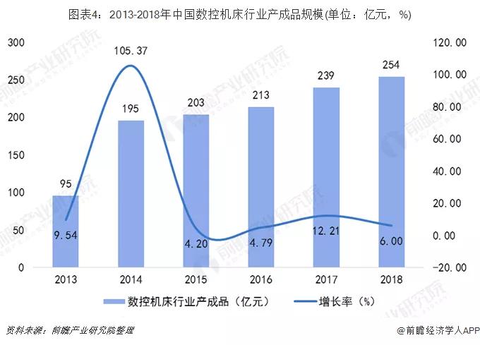 隨著我國航空航天行業(yè)、工程機械行業(yè)等的快速發(fā)展,2014年,我國數(shù)控機床行業(yè)產(chǎn)成品規(guī)模迅速擴大。2014-2017年,我國數(shù)控機床行業(yè)產(chǎn)成品逐漸增多,2018年,我國數(shù)控機床產(chǎn)成品規(guī)模達254億元,較2017年增長6.00%。